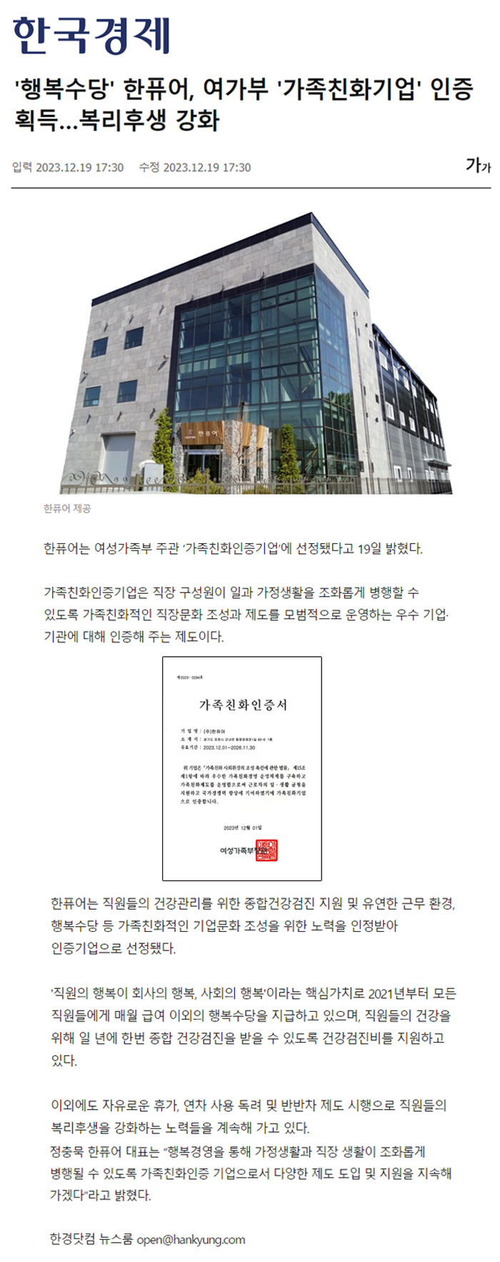 한퓨어 여성가족부 '가족친화인증' 기업 선정