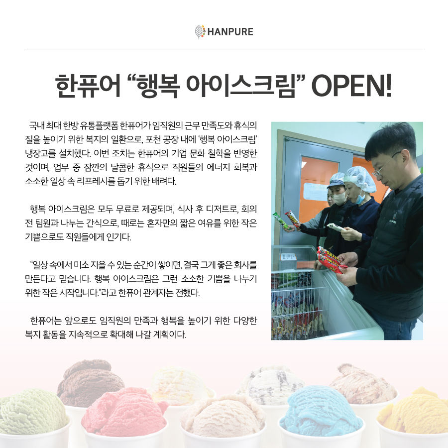 한퓨어, 포천 GMP공장에 "행복 아이스크림" OPEN! 행복 복지 실천